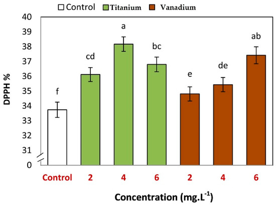 DPPH-scavenging activity of red cabbage leaves treated with different concentration of Ti and V. The mean values followed by a different letter are significantly different at p < 0.05 according to the Duncan test (n = 3).