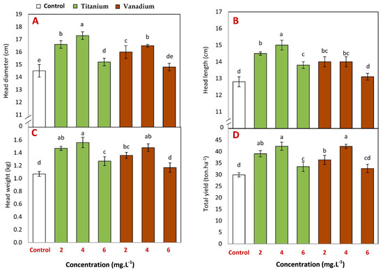 Figure 6 showed that total yield and physical quality of the head (diameter, length and weight) of red cabbage were significantly improved by the foliar application with Ti and V, compared to the control. The highest values of yield and physical quality of the head were obtained from foliar spraying with Ti at 4.0 mg L−1, while the next treatment was foliar spraying with V at 4.0 mg L−1.