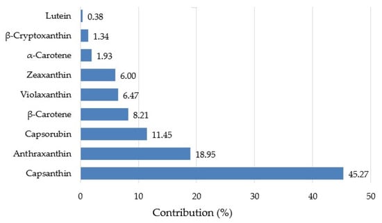 The variation in genotypes that determine specific carotenoid biosynthetic enzymes has been linked to a significant variation in carotenoid profile among Capsicum species and cultivars [17]. With the exception of a few intense orange-fruited cultivars that resulted from a mixture of red pigment, capsanthin, and yellow xanthophylls, namely, β-cryptoxanthin and violaxanthin [15,18,19], the orange color of most orange pepper cultivars is due to an abundance of β-carotene. In certain yellow/orange cultivars, the absence or inactivation of the capsanthin-capsorubin synthase enzyme has blocked the synthesis of red pigments, allowing their precursors (e.g., violaxanthin) to accumulate as the major carotenoid at the fully ripe stage [20]. Red pepper is distinguished by its high red-colored xanthophyll content and composition [12].