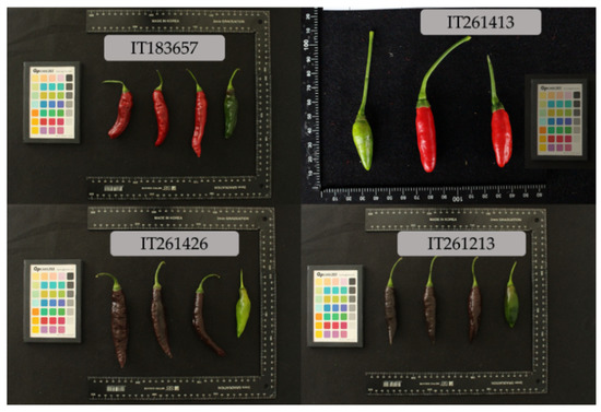 Table 3 shows four pepper genetic resources with high carotenoid content and ASTA values. IT261426, IT183657, IT261213, and IT261413 had total carotenoid content of 2430.85, 2077.55, 2062.54, and 1990.76 mg/100 g DW of pepper fruit powder, respectively. The rank of these germplasms according to ASTA value was similar, with the exception of IT183657, which did not match the total carotenoid content rank. Therefore, these pepper genetic resources in descending order of high ASTA value were as follows: IT261426 (221.32), IT261213 (211.72), IT183657 (196.31), and IT261413 (160.47), (Table 3). Capsanthin was the major contributor to total carotenoid content in all four pepper germplasms. It contributed 48.55%, 46.11%, 45.09%, and 43.81% of total carotenoid content in IT261413, IT261426, IT183657, and IT261213, respectively. The red fruits of C. annuum (var. lycopersiciforme rubrum) contained 37% capsanthin, 8% zeaxanthin, 7% cucurbitaxanthin, 3.2% capsorubin, and 9% β-carotene, according to HPLC analysis [46]. Capsorubin (20.63%) was the second-highest contributor in IT261426. This finding supports previous research that identified capsanthin and capsorubin as the main carotenoids in pepper. Antheraxenthin, on the other hand, accounted for the second major percentage of contribution (20.39%, 19.99%, and 18.32%) in IT183657, IT261213, and IT261426, respectively. Figure 3 shows fruit photos of four pepper accessions with high carotenoid content.