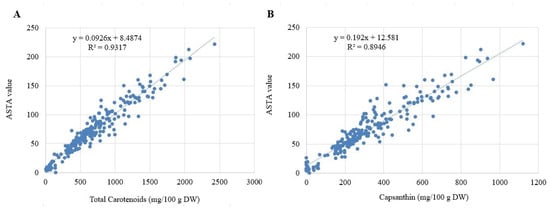 Scatter plots show the relationship between ASTA color index and Carotenoids. Total carotenoids (A), and Capsanthin (B). The fitting line, its equation (model), and the regression coefficient (R2) are also presented.