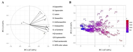 Principal component analysis (PCA) of carotenoids (Capsanthin, capsorubin, lutein, zeaxanthin, antheraxanthin, violaxanthin, α-carotene, β-carotene, and β-Cryptoxanthin) and ASTA color values (n = 226) (A). The individual pepper germplasm on the PCA plot (B). The lines starting from the center point of the bi-plot show the positive or negative associations of the parameters. The colors represented the total carotenoid content of pepper germplasms (red-blue). The pepper germplasms are indicated by their ID numbers (B) (Supplementary Table S1).