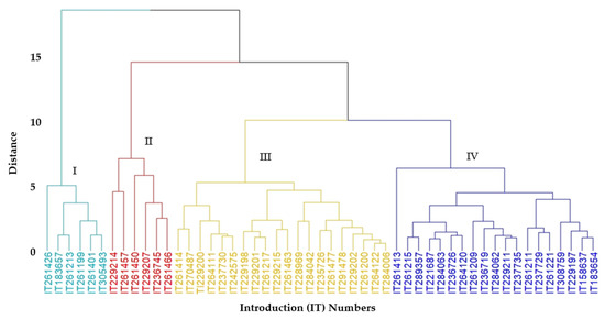A cluster analysis was performed using the carotenoid and ASTA value data sets for 51 pepper germplasms with total carotenoid contents greater than 1000 mg/100 g DW to see how the pepper genetic resources were grouped and to find germplasms with a more similar set of data (Figure 6). Even though all the tested materials belong to the C. chinense species, the pepper germplasm with an approximate amount of carotenoids and ASTA value has been classified into four clusters. The dendrogram depicts four clusters (I, II, III, and IV) consisting of 6, 6, 20, and 19 germplasms, respectively. Accessions with a high total carotenoid content IT261426, IT183657, and IT261213 were clustered in group I. The total carotenoids and ASTA values of the selected 51 pepper genetic resources are presented in Supplementary Table S2.