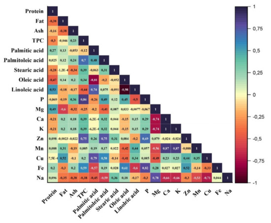 To determine the relationship among the studied parameters, Pearson correlation was performed, and the results were illustrated in Figure 1. As is seen, there were generally no significant correlations among the proximate composition except fatty acid and mineral profile. It was determined that a significant and negative and positive correlation was observed between oleic acid and palmitoleic acid (r = −0.81) and linoleic acid and palmitic acid (r = 0.74), respectively. Additionally, for all almond varieties, the sample having the highest oleic acid content had the lowest linoleic acid level, and thus a negative correlation between oleic and linoleic acid level was monitored (r = −0.98). In addition to that, between the palmitoleic acid, zinc, and phosphorus contents and total phenolic levels of the almond samples, it was determined that there was a positive correlation. For the minerals, between Fe and P (r = 0.82), Na and Mg (0.78), Mn and Ca (0.87), and Mn and K (0.87), significant positive correlations were observed while Ca and Mg and K and Mg showed negative correlation.