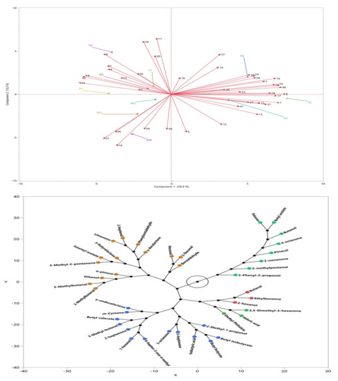 Factor loadings (top) and cluster (bottom) of the volatile compounds for almond samples.