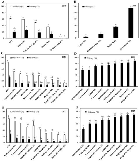 Disease incidence and severity (A,C,E) and control efficacy (B,D,F) of red leaf blotch in almond trees managed with different contact and systemic fungicides in combination with alternate products (2015–2017). The efficacy was calculated using Abbott’s formula [29]. Treatment means with different letters are significantly different according to Tukey–Kramer’s test (p < 0.05). The error bars indicate the standard error of the mean.