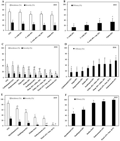 Disease incidence and severity (A,C,E) and control efficacy (B,C,F) of red leaf blotch in almond trees managed with different contact and systemic fungicides in non-alternating sprays (2015, 2018, and 2019). The efficacy was calculated using Abbott’s formula [29]. Treatment means with different letters are significantly different according to Tukey–Kramer’s test (p < 0.05). The error bars indicate the standard error of the mean.