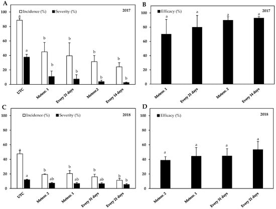 All the evaluated strategies showed a moderate to high control of the disease, with higher efficacies in 2017 (over 70% on average) than in 2018 (40–50%). In 2017, significant reductions in RLB incidence and severity were found between all treatments and the UTC (p < 0.001) (Figure 3A).