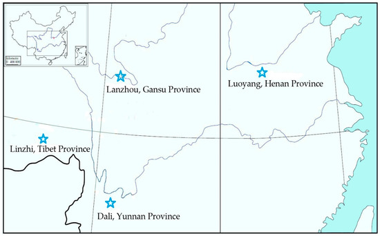 Figure 1. Collection sites of ten wild tree peonies leaves. Luoyang: P. qiui; P. decomposita; P. jishanensis; P. ostii; P. cathayana. Lanzhou: P. rockii; P. delavayi. Dali: P. lutea. Linzhi: P. ludlowii.