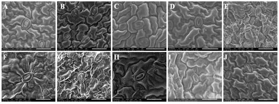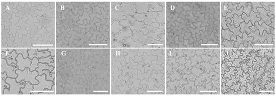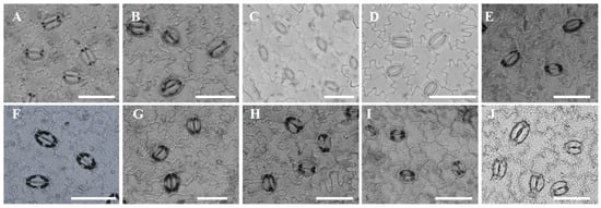 Figure 3. Characteristics of epidermal cells under light microscope in ten wild tree peonies, all abaxial. (A) P. qiui; (B) P. decomposita; (C) P. jishanensis; (D) P. ostii; (E) P. delavayi; (F) P. lutea; (G) P. potanini; (H) P. rockii; (I) P. ludlowii; (J) P. cathayana. (bar = 50 μm).