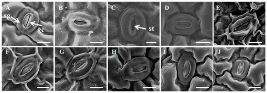 Figure 6. Stomata micrographs under scanning electron microscope in ten wild tree peonies, all abaxial. (A) P. qiui; (B) P. decomposita; (C) P. jishanensis; (D) P. ostii; (E) P. delavayi; (F) P. lutea; (G) P. potanini; (H) P. rockii; (I) P. ludlowii; (J) P. cathayana. Abbreviations: sg: subsidiary cell; gc: guard cells; st: stomatal pore. (bar = 10 μm).