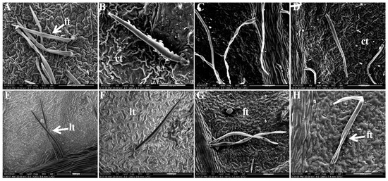 Figure 8. Trichomes under scanning electron microscopy. (A,B) P. qiui; (C,D) P. rockii; (E,F) P. jishanensis; (G,H) P. cathayana. Abbreviations: ft: flat-shaped trichomes; lt: long conic trichomes; ct: conic trichomes. (bar = 100 μm).