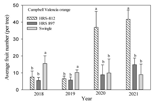 For ‘Campbell’ Valencia orange, in the years 2019 and 2020, higher values of tree height and canopy volume were observed for trees grafted in ‘HRS 897’ followed by ‘HRS 812’ and ‘Swingle’. However, in the year 2021, higher tree efficiency was found when ‘Campbell’ Valencia orange was grafted in ‘HRS 812’ rootstock. Higher total yield (#) was found in ‘HRS 812’, followed by ‘HRS 897’ and Swingle’ with equal production (Table 4).
