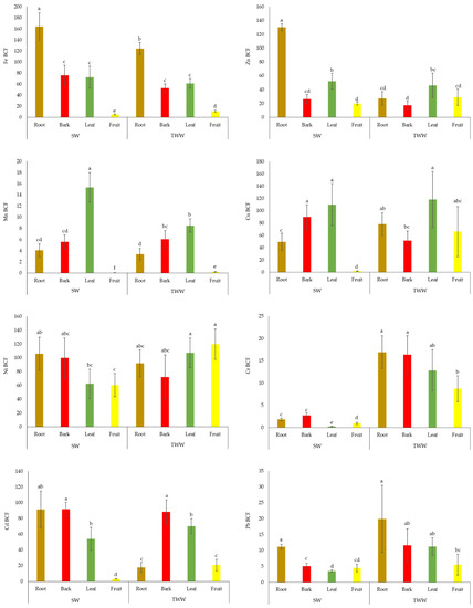 Bioconcentration factors (BCF) of different heavy metals in different parts of lemon trees irrigated with spring water (SW) and treated wastewater (TWW) at the Wadi-Musa region. Bars represent mean ± SD (n = 4). Different letters indicate significant differences according to LSD (p < 0.05).
