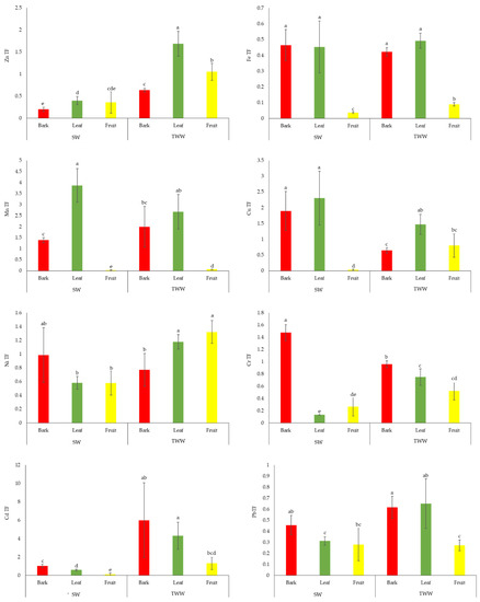 Translocation factors (TF) of different heavy metals in different parts of lemon trees irrigated with treated wastewater (TWW) and spring water (SW) in the Wadi-Musa region. Bars represent mean ± SD (n = 4). Different letters indicate significant differences according to LSD (p < 0.05).