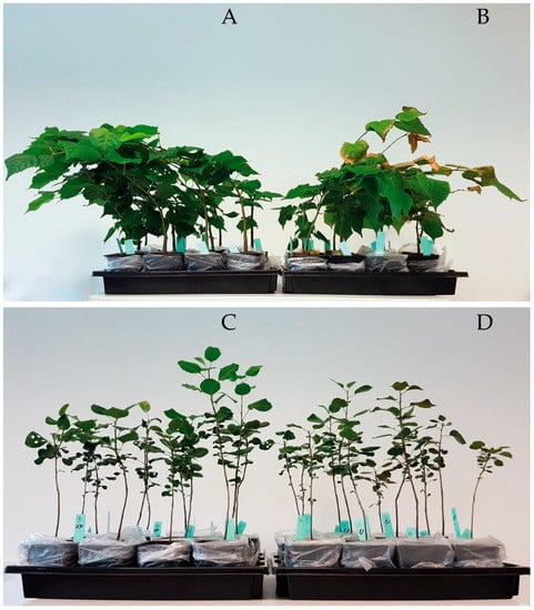 Two-year-old tree seedlings of (A,B) T. cordata and (C,D) P. pyraster; Control plants grown in the growth chamber for 50 days (A,C); and plants grown under the salt treatment (100 mM NaCl) (B,D).