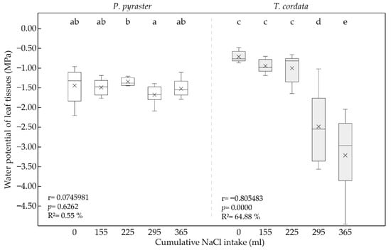 Box plot for the water potential of leaf tissues (Ψwl) of the seedlings of P. pyraster and T. cordata measured at the beginning of the experiment (0 mL) and during the experiment when treated with 100 mM NaCl solution. Significant differences between measurements (p ˂ 0.05) are indicated by different letters.