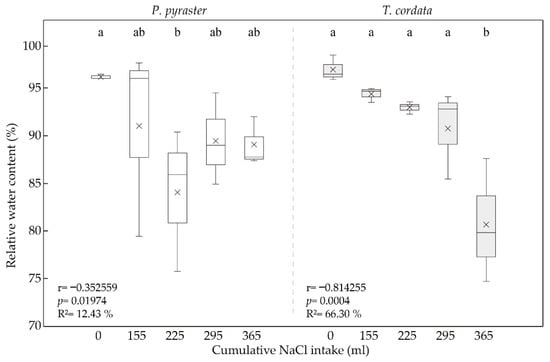 Box plot for the relative water content (RWC) for seedlings of P. pyraster and T. cordata measured at the beginning of the experiment (0 mL) and during the experiment when treated with 100 mM NaCl solution. Significant differences between measurements (p ˂ 0.05) are indicated by different letters.