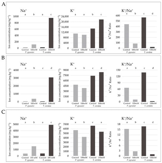 The salt ion content (Na+, K+, and K+/Na+) in the (A) leaves, (B) stems, and (C) roots of two-year-old seedlings of P. pyraster and T. cordata after 50 days of continuous 100 mM NaCl saline application and in the control. The bars indicate the mean values of the ion content in the plant organs from a sample of 10 plants. Significant differences (p ˂ 0.05) are indicated by different letters.
