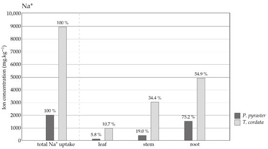 The content and distribution of Na+ ions in the plant tissues (leaves, stem, roots) of P. pyraster and T. cordata seedlings grown for 50 days under salt treatment with 100 mM NaCl solution. The values above the bars indicate distribution to the plant organs as a percentage of the total Na+ ion uptake.