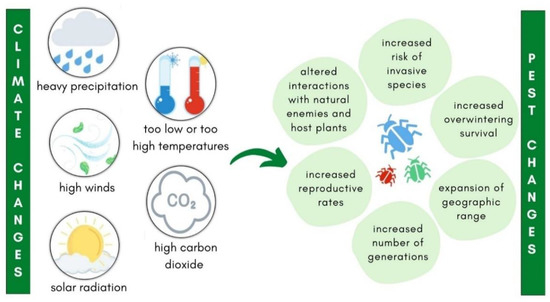 The aforementioned conditions have recently been causing major problems in all areas of agriculture, as well as in the monitoring and control of insect pests [7]. Pest insects are strongly affected by climate change (Figure 1). Temperature fluctuations directly affect their biology and ecology, including reproduction, population dynamics, distribution, survival, and their relationships with the environment and natural enemies (Figure 1) [29,30,31,32]. Long-term data on insect phenology show that the occurrence of insect pests varies under changing climatic conditions [33,34,35]. Climate change leads to increased reproductive rate, which results in multivolatility of many insect pests (Figure 1) and consequently more crop damage [33].