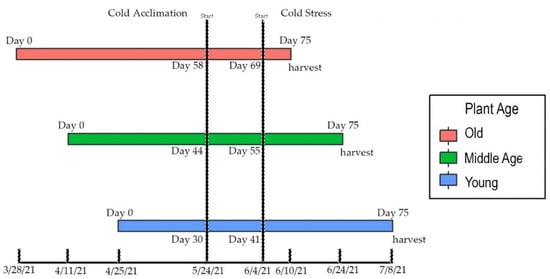 Timeline depicting the staggered planting groups in relation to planting, start of their cold acclimation periods and cold stress treatments, and harvest.