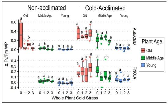 ΔFv/FmWP box plots comparing whole-plant cold stress and plant age for cold-acclimated and non-acclimated ‘AutoCBD’ and ‘FINOLA’ plants. Data represent the difference between Fv/Fm taken before and after whole-plant cold stress. Non-acclimated plants received no cold acclimation period, and cold-acclimated plants were subject to 10 days at 10 °C. Cold stress consisted of no exposure, 0 (control); a single 3 h −0.5 °C exposure, 1; two consecutive 3 h −0.5 °C exposures separated by 24 h, 2; and three 3 h −0.5 °C exposures separated by 24 h, 3. Plant age treatments include oldest plants, middle-age plants, and youngest plants (68, 54, and 40 days old on the day of whole-plant cold stress, respectively). Y axis scale differs between acclimation treatments to accurately reflect data ranges. Lowercase letters indicate significant differences (p < 0.05) between treatments (Tukey’s test).
