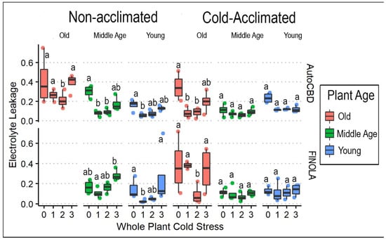 ELWP box plots comparing whole-plant cold stress and plant age for cold-acclimated and non-acclimated ‘AutoCBD’ and ‘FINOLA’ plants. Electrolyte Leakage represents the ratio between electrical conductivity (EC) of leaf sample after whole-plant cold stress and EC of leaf sample after cell lysis. Non-acclimated plants received no cold acclimation period, and acclimated plants were subject to 10 days at 10 °C. Cold stress consisted of no exposure, 0 (control); a single 3 h −0.5 °C exposure, 1; two consecutive 3 h −0.5 °C exposures separated by 24 h, 2; and three 3 h −0.5 °C exposures separated by 24 h, 3. Plant age treatments include oldest plants, middle-age plants, and youngest plants (68, 54, and 40 days old on the day of whole-plant cold stress, respectively). Lowercase letters indicate significant differences (p < 0.05) between treatments (Tukey’s test).