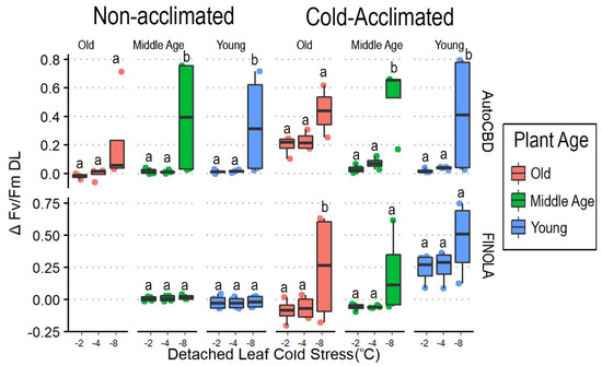 ΔFv/FmDL box plots comparing detached-leaf cold stress and plant age in cold-acclimated and non-acclimated ‘AutoCBD’ and ‘FINOLA’ plants. Data represent the difference between Fv/Fm taken before whole-plant cold stress and after detached-leaf cold stress. Non-acclimated plants received no cold acclimation period, and cold-acclimated plants were subject to 10 days at 10 °C. Detached-leaf cold stress consisted of a single 3 h −2 °C exposure, a single 3 h −4 °C exposure, and a single 3 h −8 °C exposure. Plant age treatments include oldest plants, middle-age plants, and youngest plants (68, 54, and 40 days old on the day of whole-plant cold stress, respectively). Y axis scale differs between acclimation treatments to accurately reflect data. Lowercase letters indicate significant differences (p < 0.05) between treatments (Tukey’s test).