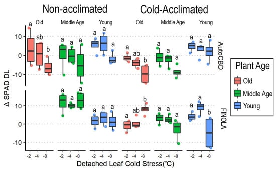 ΔSPADDL box plots comparing detached-leaf cold stress and plant age. Data represent the difference in mean SPAD taken before whole-plant cold stress and after detached-leaf cold stress. Detached-leaf cold stress consisted of a single 3 h −2 °C exposure, a single 3 h −4 °C exposure, and a single 3 h −8 °C exposure. Plant age treatments include oldest plants, middle-age plants, and youngest plants (68, 54, and 40 days old on the day of whole-plant cold stress, respectively). Lowercase letters indicate significant differences (p < 0.05) between treatments (Tukey’s test).