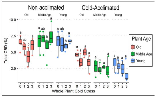 Total CBD (%) box plot comparing whole-plant cold stress to acclimation treatment and plant age in ‘AutoCBD’. Data represent the percentage of CBD’s neutral form added to the product of the percentage of CBD acid form multiplied by the cannabinoid’s molecular weight (0.877). Plants receiving cold acclimation treatment were subject to 10 days at 10 °C. Whole-plant cold stress consisted of a control treatment receiving no cold exposure, 0 (control); a single 3 h −0.5 °C exposure, 1; two consecutive 3 h −0.5 °C exposures separated by 24 h, 2; and three 3 h −0.5 °C exposures separated by 24 h, 3. Plant age treatments include oldest plants, middle-age plants, and youngest plants (68, 54, and 40 days old on the day of whole-plant cold stress, respectively). Lowercase letters indicate significant differences (p < 0.05) between treatments (Tukey’s test).