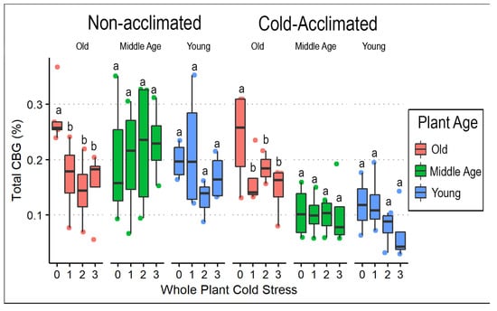 Total CBG (%) box plots comparing whole-plant cold stress to acclimation treatment and plant age in ‘AutoCBD’. Data represent the percentage of CBG added to the product of the percentage of CBGA multiplied by the cannabinoid’s molecular weight ratio (0.878 and 0.877). Plants receiving cold acclimation treatment were subject to 10 days at 10 °C. Whole-plant cold stress consisted of a control treatment receiving no cold exposure, 0 (control); a single 3 h −0.5 °C exposure, 1; two consecutive 3 h −0.5 °C exposures separated by 24 h, 2; and three 3 h −0.5 °C exposures separated by 24 h, 3. Plant age treatments include oldest plants, middle-age plants, and youngest plants (68, 54, and 40 days old on the day of whole-plant cold stress, respectively). Letters indicate differences amongst consecutive cold exposures between cultivars, plant age, and acclimation. Lowercase letters indicate significant differences (p < 0.05) between treatments (Tukey’s test).
