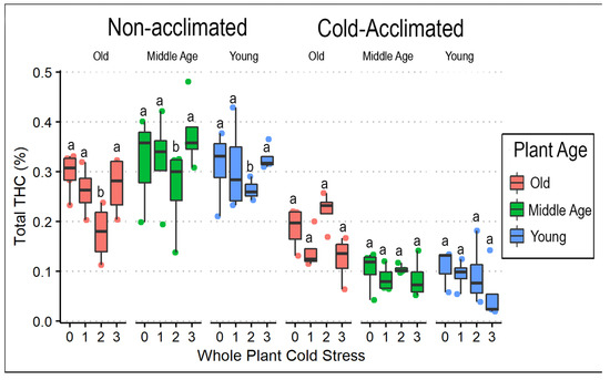 Total THC (%) box plots comparing whole-plant cold stress to acclimation treatment and plant age in ‘AutoCBD’. Data represent the percentage of THC added to the product of the percentage of THCA multiplied by the cannabinoid’s molecular weight ratio (0.878). Plants receiving cold acclimation treatment were subject to 10 days at 10 °C. Whole-plant cold stress consisted of a control treatment receiving no cold exposure, 0 (control); a single 3 h −0.5 °C exposure, 1; two consecutive 3 h −0.5 °C exposures separated by 24 h, 2; and three 3 h −0.5 °C exposures separated by 24 h, 3. Plant age treatments include oldest plants, middle-age plants, and youngest plants (68, 54, and 40 days old on the day of whole-plant cold stress, respectively). Letters indicate differences amongst consecutive cold exposures between cultivars, plant age, and acclimation. Lowercase letters indicate significant differences (p < 0.05) between treatments (Tukey’s test).