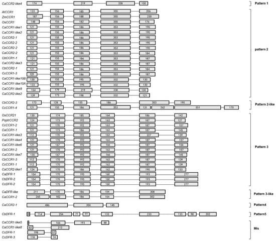 Intron–exon structures of the above CCRs and CCR-like genes showed that pepper CCRs were composed of 2–10 exons (Figure 1). Based on the number of exons and exon–intron structures, Barakat et al. [26] grouped P. trichocarpa CCR and CCR-like genes into three exon–intron patterns (Patterns 1–3), and Park et al., 2017, grouped O. sativa CCR and CCR-like genes into five exon–intron patterns (Patterns 2–6). Most previously studied functional CCRs, such as AtCCR1, EuCCR (E. gunnii CCR), ZmCCR1 (Z. mays CCR1), SbCCR1 (Sorghum bicolor CCR1), and Os CCR1, are composed of five exons, as in the exon–intron structure Pattern 2 [16,21,24,35]. In this study, 14 CCRs such as CaCCR1-like1 had five exons, with a Pattern 2 exon–intron structure, and 13 CCRs such as CcCCR1-2 had six exons as in Pattern 3. Although CbCCR2-3 had six exons and CcCCR1-4 had eight exons, their exon–intron structure was more similar to that of Pattern 2 and we term these Pattern 2-like. On the contrary, CaDFR-like and CaCCR1-2 had five exons, their exon–intron structures were more similar to that of Pattern 3, so we term these Pattern 3-like (Figure 1). The four-exon structure of CaCCR2-like4 is different to Pattern 1 in PoptrCCR1 and we designated this group as new Pattern 1. CaCCR2-1 had three exons and CbDFR-1 had 10 exons with a different pattern, so we named the two groups as Patterns 4 and 5, which are different from O. sativa [35]. The other pepper CCRs were composed of 2–4 exons with much shorter ORF lengths than those of functional CCR genes (Figure 1).