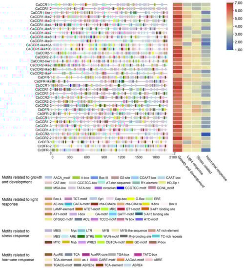 PLANTCARE software was used to analyze the sequence 2000 bp upstream from the initiation codon in pepper CCRs and revealed that the promoters of pepper CCRs contained four kinds of regulatory elements: growth and development, stress, hormone, and light response (Figure 2).