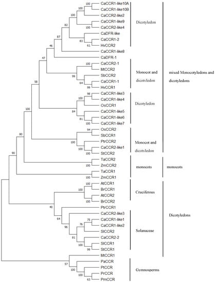 Phylogenetic tree analysis of CCR and CCR-like gene family protein sequences from Capsicum annuum L. and other species. A. thaliana CCRs (AtCCR1, AAG46037; AtCCR2, AAG53687); Hordeum vulgare (HvCCR1, XP_044948571.1; HvCCR2, KAE8782947.1); Zea mays (ZmCCR1, NP_001105488.1; ZmCCR2, NP_001105715); Solanum tuberosum (StCCR1, XP_006356249.1; StCCR2, XP_006342181.1); Sorghum bicolor (SbCCR1, XP_021306123.1; SbCCR2, XP_021312001.1); T. aestivum CCRs (TaCCR1, ABE01883; TaCCR2, AY771357); Oryza sativa (OsCCR1, XP_015621618.1; OsCCR2, XP_025883369.1); Populus trichocarpa (PtrCCR1, XP_006368516.2; PtrCCR2, XP_002300619.2); Pinus massoniana (PmCCR, ACE76870.3); Pinus taeda (PtCCR, AAL47684. 1); Pinus radiata (PrCCR, AFC38436.1); Picea abies (PaCCR, CAK18610.1).