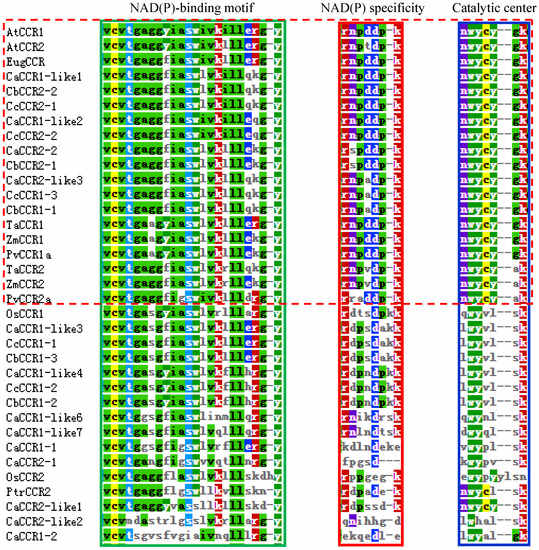 The most striking homology between the predicted peptide sequences of pepper CCRs and functional plant CCRs was found in regions covered by two highly conserved motifs (Figure 4). These were the NAD(P)-binding motif at the N-terminus, and the catalytic motif for CCR activity. The former is a well-conserved motif for cofactor binding in the mammalian 3b-HSD/plant DFR protein superfamily [16,36,37]. The latter is a CCR signature motif (NWYCYGK), in which the NWYCY sequence may be crucial for CCR activity [16,26,37]. Especially, the NWYCY sequences of plant CCRs were identical in the blue dashed box (Figure 4). The above results suggest that CaCCR1-like1, CaCCR1-like2, CaCCR2-2, CaCCR2-like3, CbCCR1-1, CbCCR2-1, CbCCR2-2, CcCCR1-3, CcCCR2-1, and CcCCR2-2 were likely candidates for functional CCRs in pepper, with CaCCR1-like1, CaCCR1-like2, CaCCR2-2, and CaCCR2-like3 being the most plausible candidates.