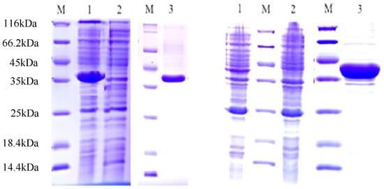 SDS-PAGE analysis of purified recombinant proteins from E. coli. M: molecular mass standards. Note: 5-Left: Lane 1: pET28a-CcCCR1; lane 2: empty pET28a vector; lane 3, purified pET28a-CcCCR1. 5-Right lane 1: pET28a-CcCCR2; lane 2: empty pET28a vector; lane 3, purified pET28a-CcCCR2.