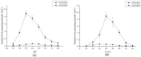 The recombinant CcCCR1 maintained high catalytic activity between the reaction system pH 6.0–6.5. When the pH was more than 6.5, the enzyme activity decreased rapidly, and when the reaction system temperature was 30–40℃, the enzyme showed good activity, and the enzyme was almost inactivated at the highest temperature of 80 °C and the lowest temperature of 10 °C. The activity of recombinant CcCCR2 was the highest at pH 5.5, and then decreased rapidly, while the protein maintained high catalytic activity at 40 °C (Figure 6).