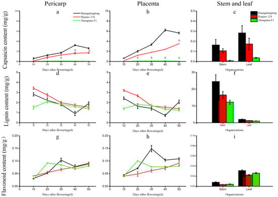 Comparison of capsaicin, lignin, and flavonoids in different tissues at different stages. Note: (a,b,d,e,g,h) The abscissa is the days after flowering, and the ordinate is the content of capsaicin/lignin/flavonoids in pericarp and placenta of different peppers. (c,f,i) The abscissa is different organizations, and the ordinate is the content of capsaicin/lignin/flavonoids in organizations of different pepper varieties.