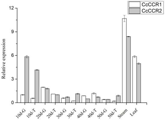 Expression pattern and functional relationship analysis showed that PvCCR1 was probably associated with lignin biosynthesis during plant development, whereas PvCCR2 may function in defense [19], and Mt-CCR1 was the major CCR involved in lignin biosynthesis, whereas Mt-CCR2 was proposed to be involved in an alternative route for S lignin biosynthesis in M. truncatula [27]. In our results, the CcCCR2 expression level has a significant correlation with lignin content, so it may play a more key role in regulating lignin synthesis than CCR1 (Table 3).