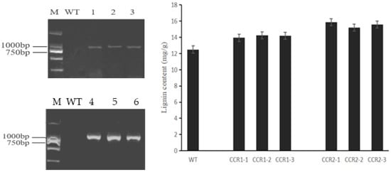 PCR and lignin content detection of Arabidopsis thaliana. Note: CCR1-1, CCR1-2, and CCR1-3 were three different CCR1 transgenic Arabidopsis plants. CCR2-1, CCR2-2, and CCR2-3 were three different CCR2 transgenic Arabidopsis plants. M: DL2000 marker; 1–3: CcCCR1 transgenic plants, 4–6: CcCCR2 transgenic plants.