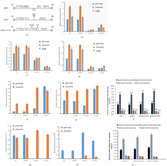 In order to confirm the role of CCR in the regulation of spicy taste of Huangdenglong pepper, pTRV1, pTRV2, and pTRV2-CcCCRs silencing vectors containing CCR1 and CCR2 were introduced into Agrobacterium tumefaciens (Figure 10a), and the fruit stalk of young fruit of about 5 DAF was injected by injection method in Huangdenglong pepper (Figure S3). Two weeks after inoculation, the relative expression level of CcCCR1 in pericarp, placenta, and fruit stalk of CcCCR1 silent plants were 6, 6.4, and 12.9% of the control, respectively (Figure 10b), with the decrease of 62, 48.7, and 54.2% for CcCCR2 and 83, 82.1, and 82.7% for CAD, respectively (Figure 10c,d). On the contrary, the relative expression level of PAL, pAMT, and CS genes in placenta increased by 1.7, 2.26, and 0.38 times, respectively. The relative expression level of 4CL in pericarp and placenta did not change much (Figure 10e–h).