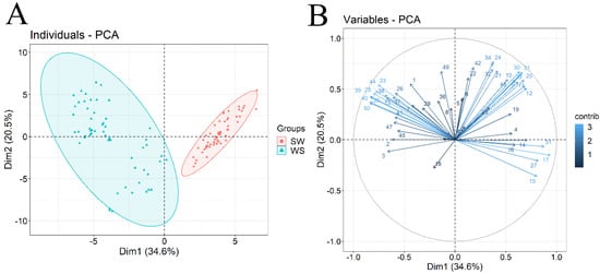 Unsupervised PCA was used to describe the volatile compound profile of black tea based on concentration (Figure 1). Samples were clearly separated into two groups according to WS and SW treatments (principal components 1 and 2 explained 34.6% and 20.5%, respectively; Figure 1A), indicating that the processes caused significant differences in volatile compound concentrations (p < 0.05). Figure 1B illustrates the contribution level of each volatile compound. Notably, some compounds with partial floral characteristics (Table S2), such as linalool, 3,7-dimethyl-1,5,7-octatrien-3-ol, (3R,6S) -2,2,6-trimethyl-6-vinyltetrahydro-2H-pyran-3-ol and geraniol, were more inclined to contribute to the SW treatment, while other compounds with a fruity-biased character, such as hexanal, cis-3-hexenyl acetate, hexyl hexanoate and trans-2-hexenal, were more inclined to contribute to the WS treatment, suggesting that the treatments contributed to differences in the aroma characteristics with WS enhancing fruity aromas and SW enhancing floral aromas.