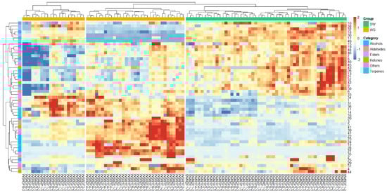 Clustering heat map of volatile compounds in black teas processed by withering-shaking and shaking-withering. The numbers in the row names of the heat map represent compounds, and the correspondence between numbers and compounds is shown in Table S1 of the Supplementary Materials.