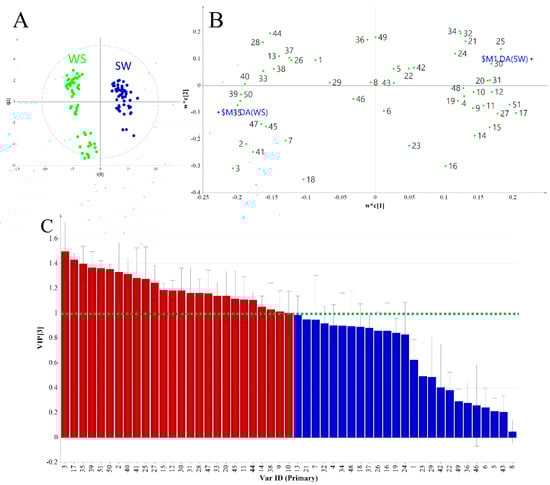 (A) Partial least squares discriminant analysis (PLS-DA) scores plot, (B) loading plot, and (C) variable importance prediction (VIP) plot of volatile compounds in black teas processed by withering-shaking and shaking-withering. (B,C): The numbers on the abscissa represent compounds, and the corresponding relationship between numbers and compounds is shown in Table S1 of the Supplementary Materials.
