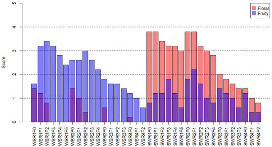 Sensory evaluation scores of the aroma of black teas processed under various conditions. Purple is the color that appears when red and blue are stacked, indicating that this sample has both floral and fruity aromas.