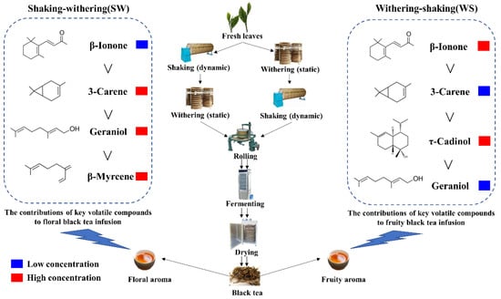 Different processing steps have significant effects on volatile compounds [17], but there is a lack of detailed descriptions of the aroma qualities of black teas using different sequences of withering and shaking. This study assessed two methods—withering-shaking (WS) and shaking-withering (SW)—in combination with the traditional rolling and fermenting processing of black tea. Volatile compounds in processed black tea were detected by gas chromatography-tandem mass spectrometry (GC-MS/MS), and principal component analysis (PCA), partial least squares discriminant analysis (PLS-DA), cluster analysis, odor activity value (OAV) analysis, and sensory evaluation were used to analyze differences and overall aroma characteristics under the two treatments. This study provides a theoretical basis and technical guidance for precise, directed development of a floral-fruity aroma bias in black tea processing.