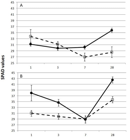 Moreover, under the more extreme iron limiting conditions (20 mM NaHCO3) (Figure 2B), hybrids belonging to Pcc had a higher leaf chlorophyll content than the other species (p = 0.034), during the first days (1st and 3rd) and also at the end of the assay. The recovery of the leaf chlorophyll content under the higher pH buffering capacity of this conditioning media was slower than at 10 mM NaHCO3, as indicated by the fact that on the seventh day the chlorophyll level reached a minimum for all hybrids.