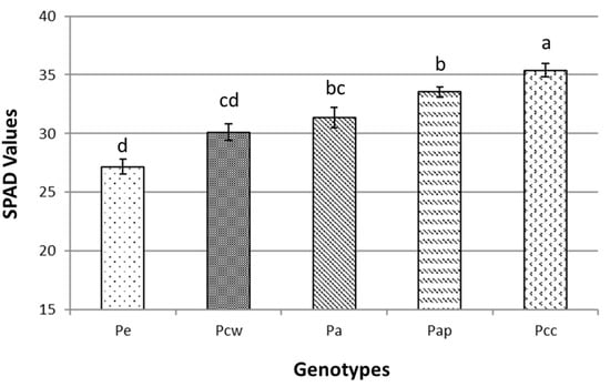 Average total chlorophyll level (SPAD) measured in leaves from four interspecific Pyrus hybrids (Pa, Pap, Pcc, Pe) and open pollinated Pyrus communis ‘Williams’ (Pcw) under in vitro iron deficiency conditions. Since no significant interaction was observed between NaHCO3 and Pyrus species (p = 0.452), mean values come from the measures of 32 replicates per genotype. Bars represent the standard error. Hybrids with different letter are significantly different (Tukey, p < 0.05).